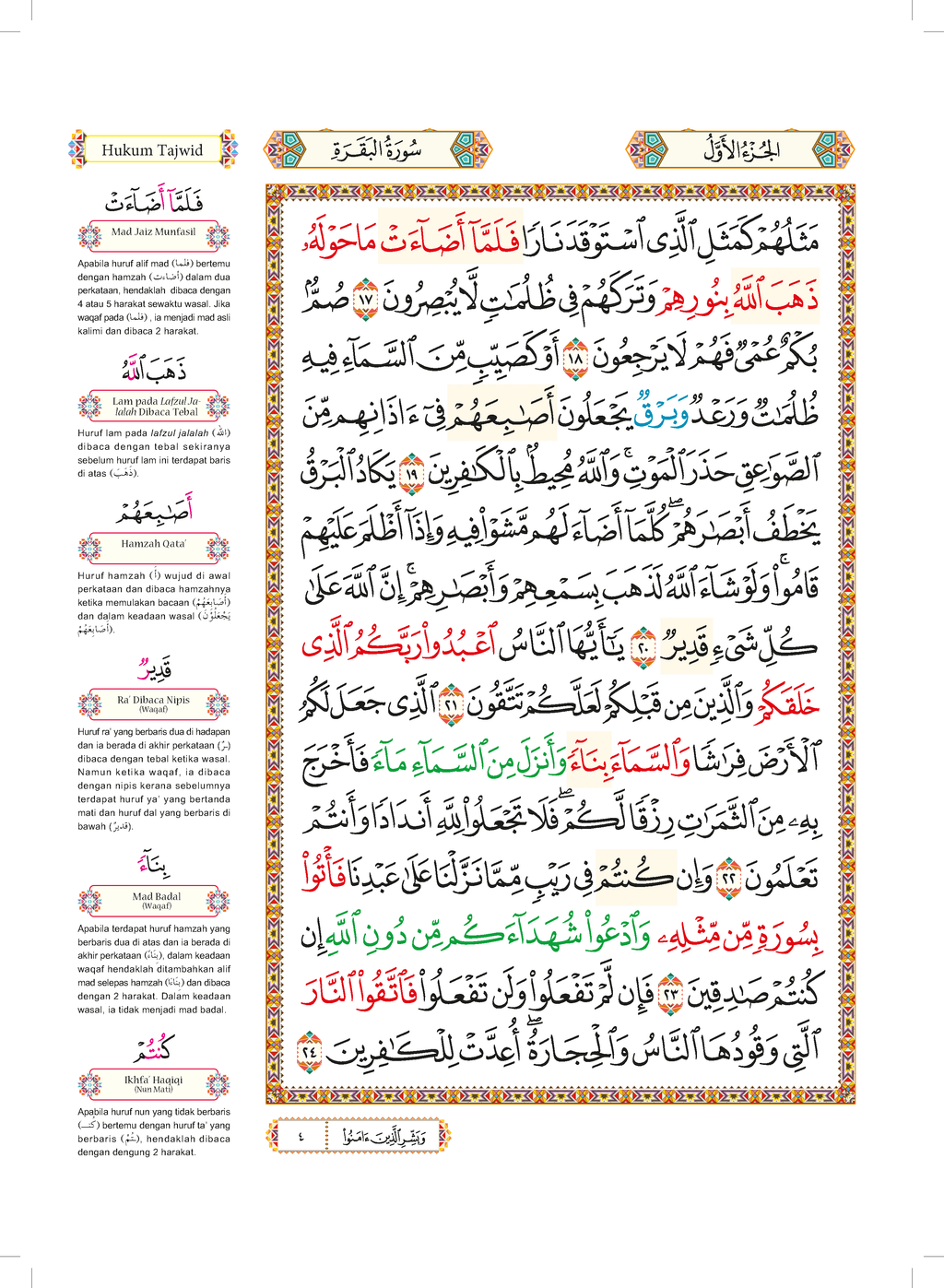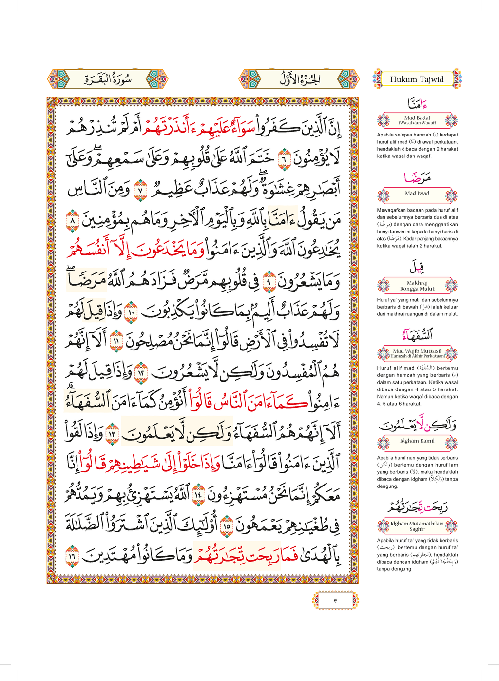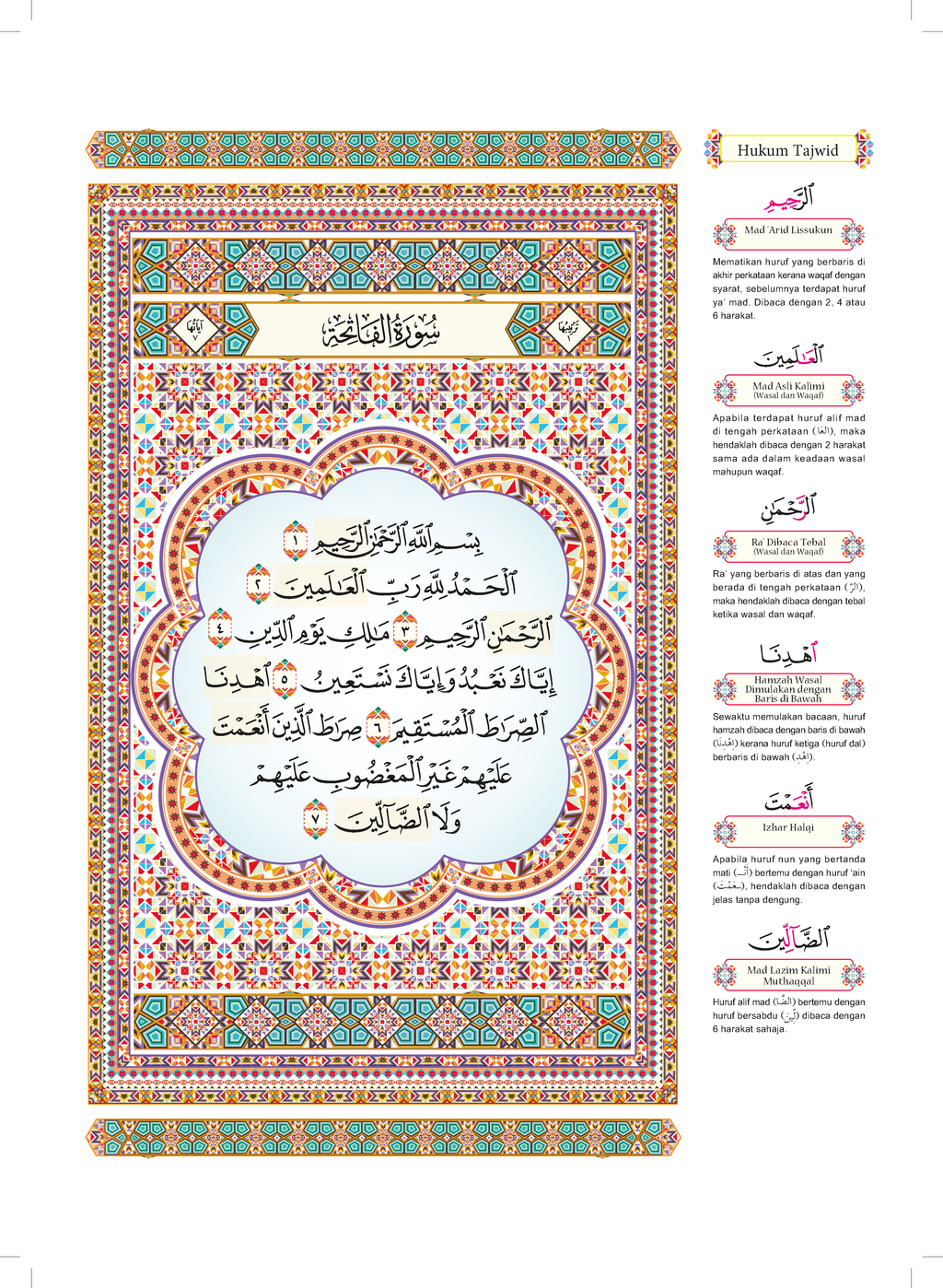 • Huraian hukum tajwid secara jelas di sebelah kanan dan kiri jidar setiap halaman mushaf