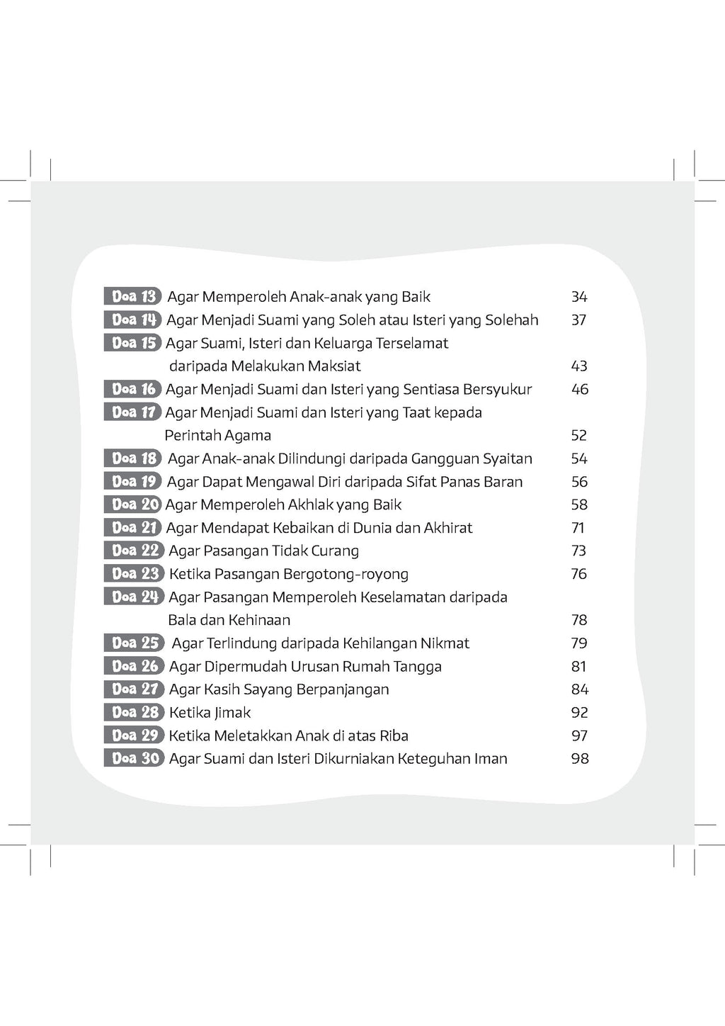 Antara doa-doa yang dimaksudkan ialah doa memohon keteguhan iman, menanam kasih sayang antara suami isteri, memohon keselamatan, memohon agar mendapat zuriat yang soleh, diberi kesabaran dan kekuatan, tempat kediaman dilindungi, mengelak daripada jiran yang jahat, menenangkan diri dalam keadaan panas baran, marah dan musibah, berlindung daripada gangguan syaitan, berdoa untuk kesejahteraan anak-anak, mengelak kecurangan antara suami atau isteri, memohon keberkatan rezeki, mengelakkan bebanan hutang, mengelakkan kehinaan serta bala bencana dan bagaimana menangani stres.