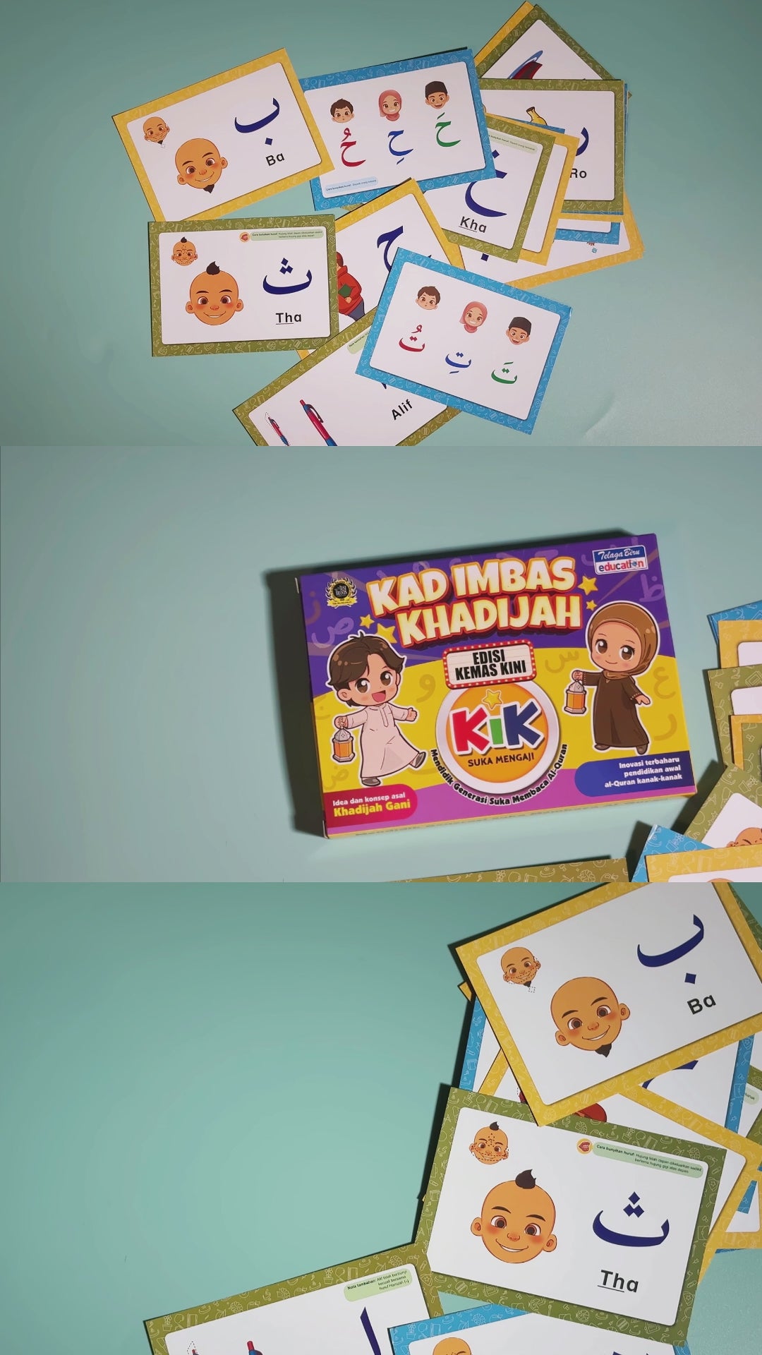 Kad Imbas Khadijah ini memperkenalkan huruf tunggal mengikut kesamaan bentuk dan rupa huruf dengan sedikit imiginasi serta mengikut cara membunyikan huruf yang betul dan ia merangsang fungsi optimum otak kiri dan otak kanan anak-anak. Antara ciri istimewa yang terdapat dalam buku ini ialah baris asal diperkenalkan dengan mimik muka, iaitu baris yang diwakili oleh mimik muka yang mudah diikuti dan menyeronokkan. Konsep pengenalan huruf tunggal harus berbeza daripada fungsi huruf berbaris supaya anak-anak tidak keliru dengan huruf jawi dan dapat memahami hukum tajwid dengan lebih baik. Iainya satu-satunya kad imbas yang menggunakan kaedah penceritaan bagi memudahkan anak-anak kecil mengingat ciri bentuk huruf (bukan menghafal huruf) serta dapat mewujudkan suasana ceria sambil belajar.