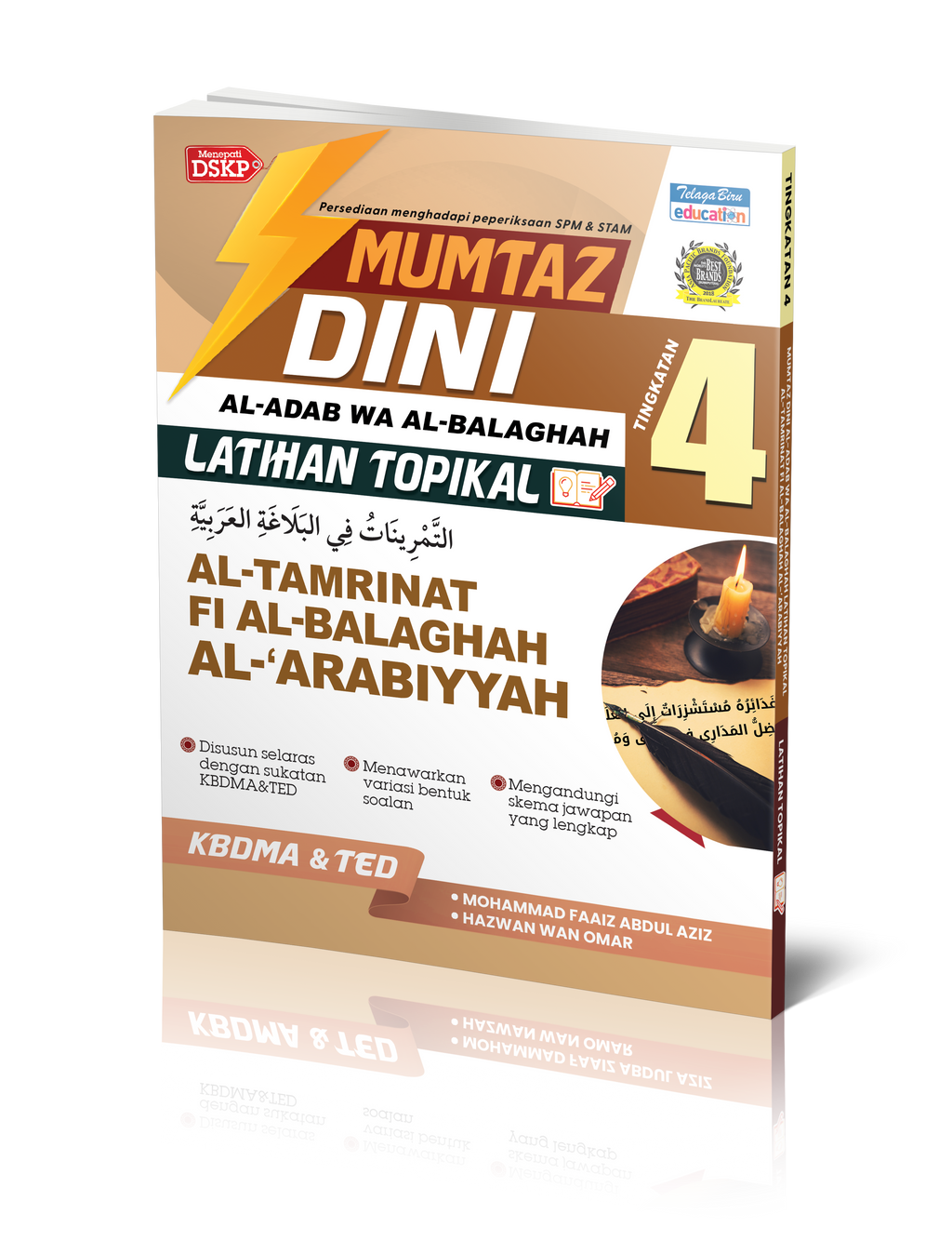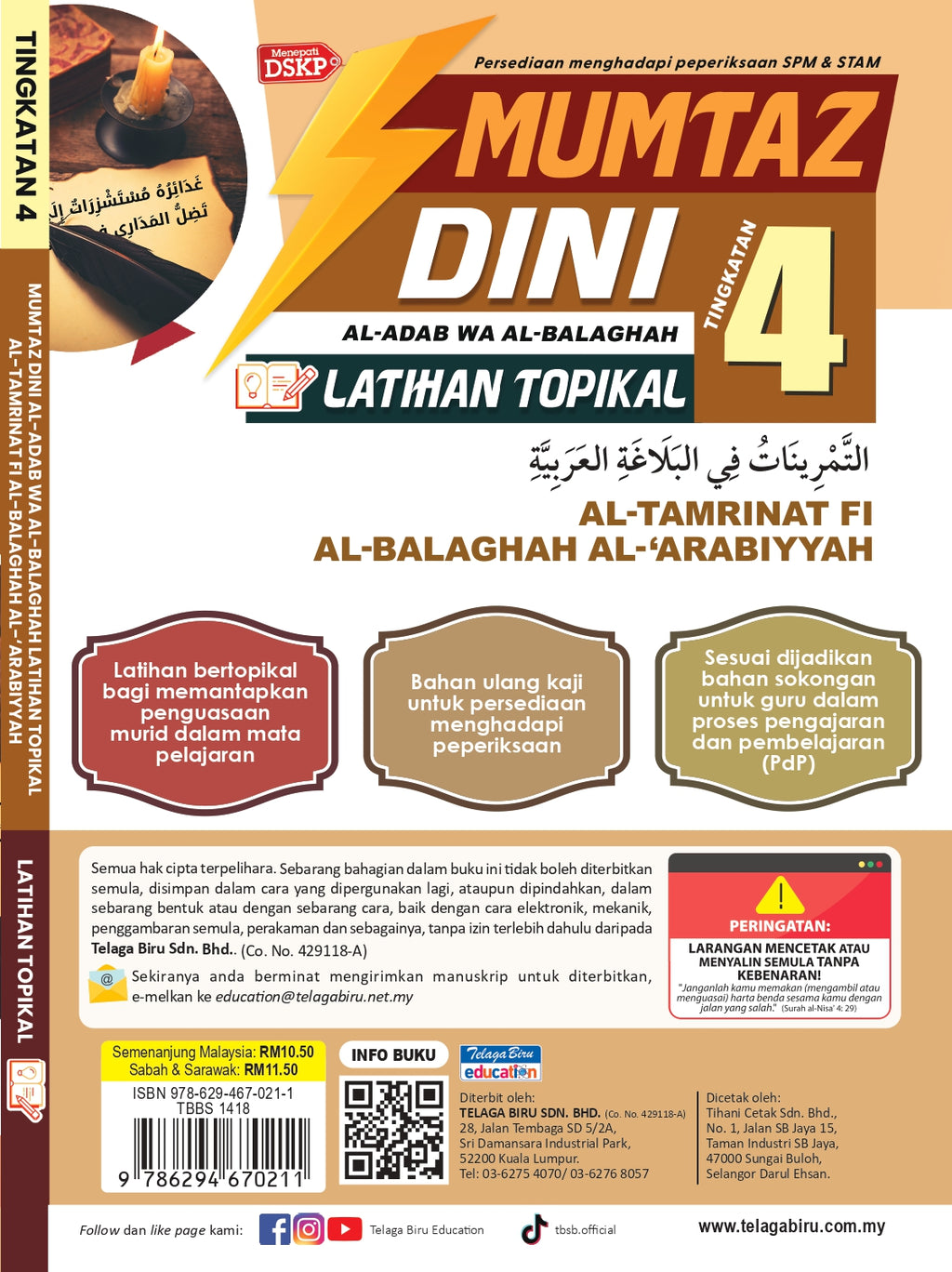 Mumtaz Dini Latihan Topikal Al-Tamrinat Fi Al-Balaghah Al-Arabiyyah Tingkatan 4 ini merupakan latihan bertopikal bagi memantapkan penguasaan murid dalam mata pelajaran. Buku ini juga merupakan bahan ulang kaji untuk persediaan menghadapi peperiksaan. Ianya sesuai dijadikan bahan sokongan untuk guru dalam proses pengajaran dan pembelajaran (PdP).