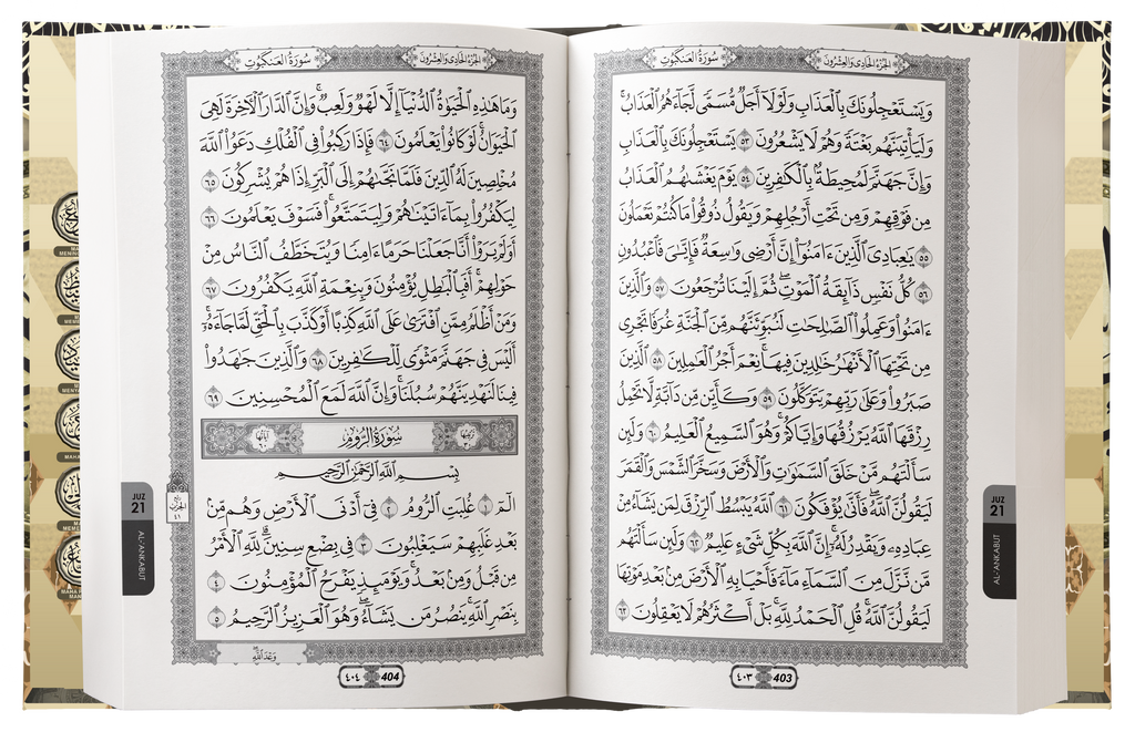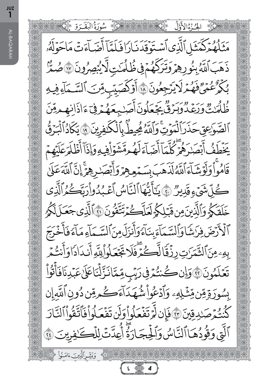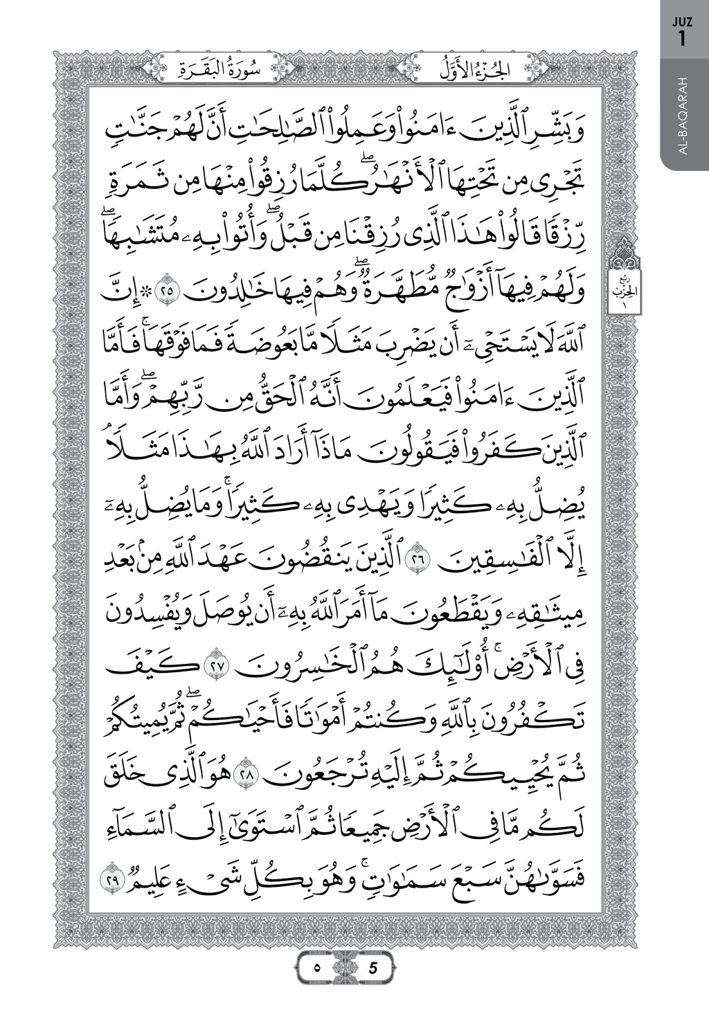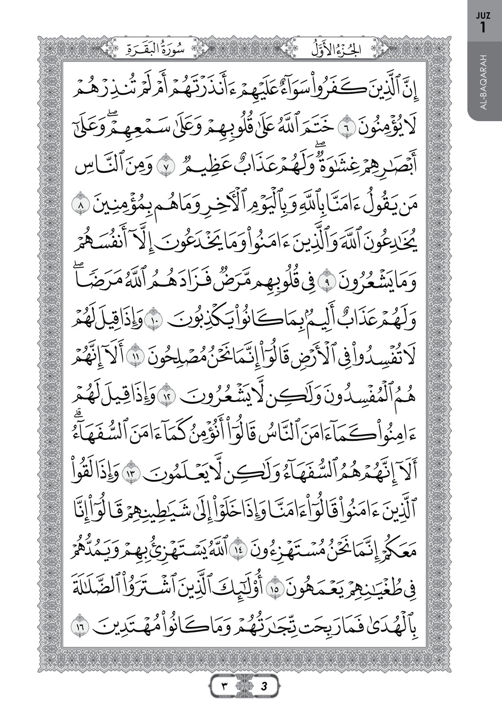 - Diselitkan penanda bilangan juzuk dan nama surah pada bahagian tepi mushaf.