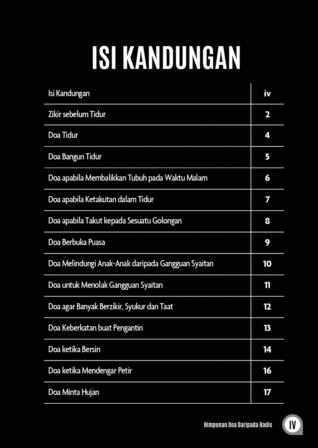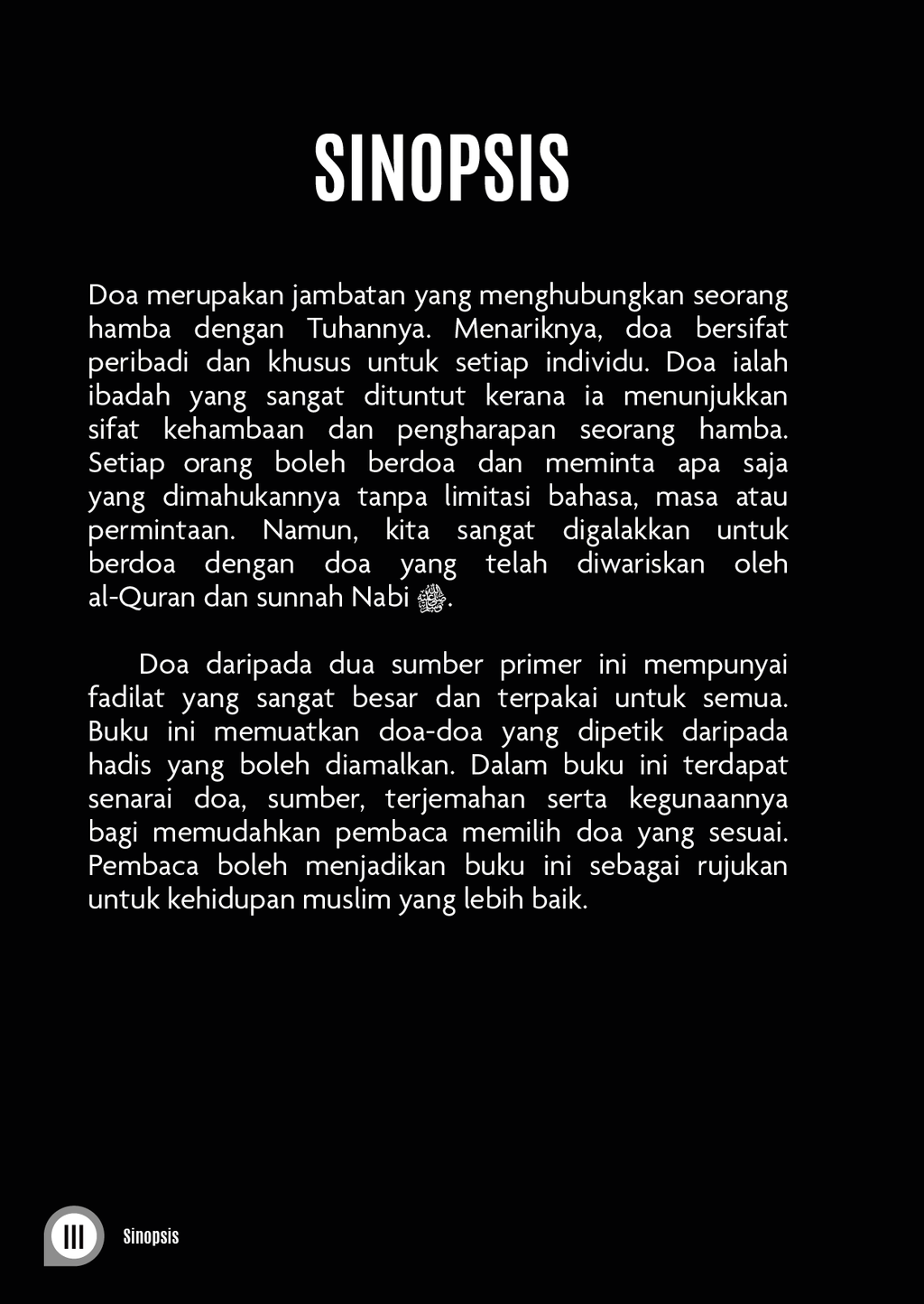 Doa daripada dua sumber primer ini mempunyai fadilat yang sangat besar dan terpakai untuk semua. Memuatkan doa-doa yang dipetik daripada al-Quran. Dalam buku ini terdapat senarai doa, sumber, terjemahan serta kegunaanya bagi memudahkan pembaca memilih doa yang sesuai. Pembaca boleh menjadikan buku ini sebagai rujukan untuk kehidupan Muslim yang lebih baik.