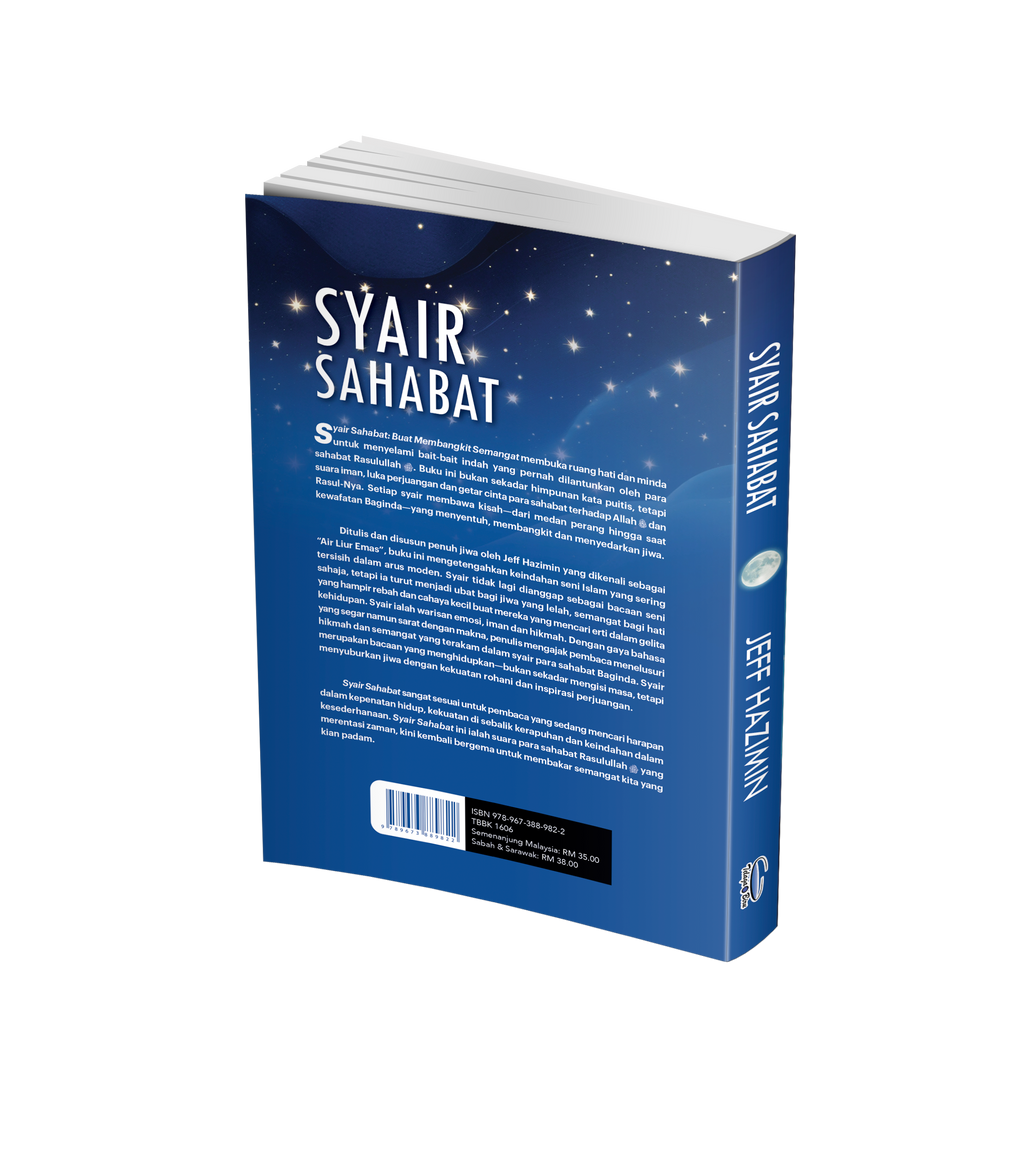 Syair Sahabat: Buat Membangkit Semangat membuka ruang hati dan minda untuk menyelami bait-bait indah yang pernah dilantunkan oleh para sahabat Rasulullah SAW. Buku ini bukan sekadar himpunan kata puitis, tetapi suara iman, luka perjuangan dan getar cinta para sahabat terhadap Allah dan Rasul-Nya. Setiap syair membawa kisah – dari medan perang hingga saat kewafatan Baginda – yang menyentuh, membangkit dan menyedarkan jiwa.